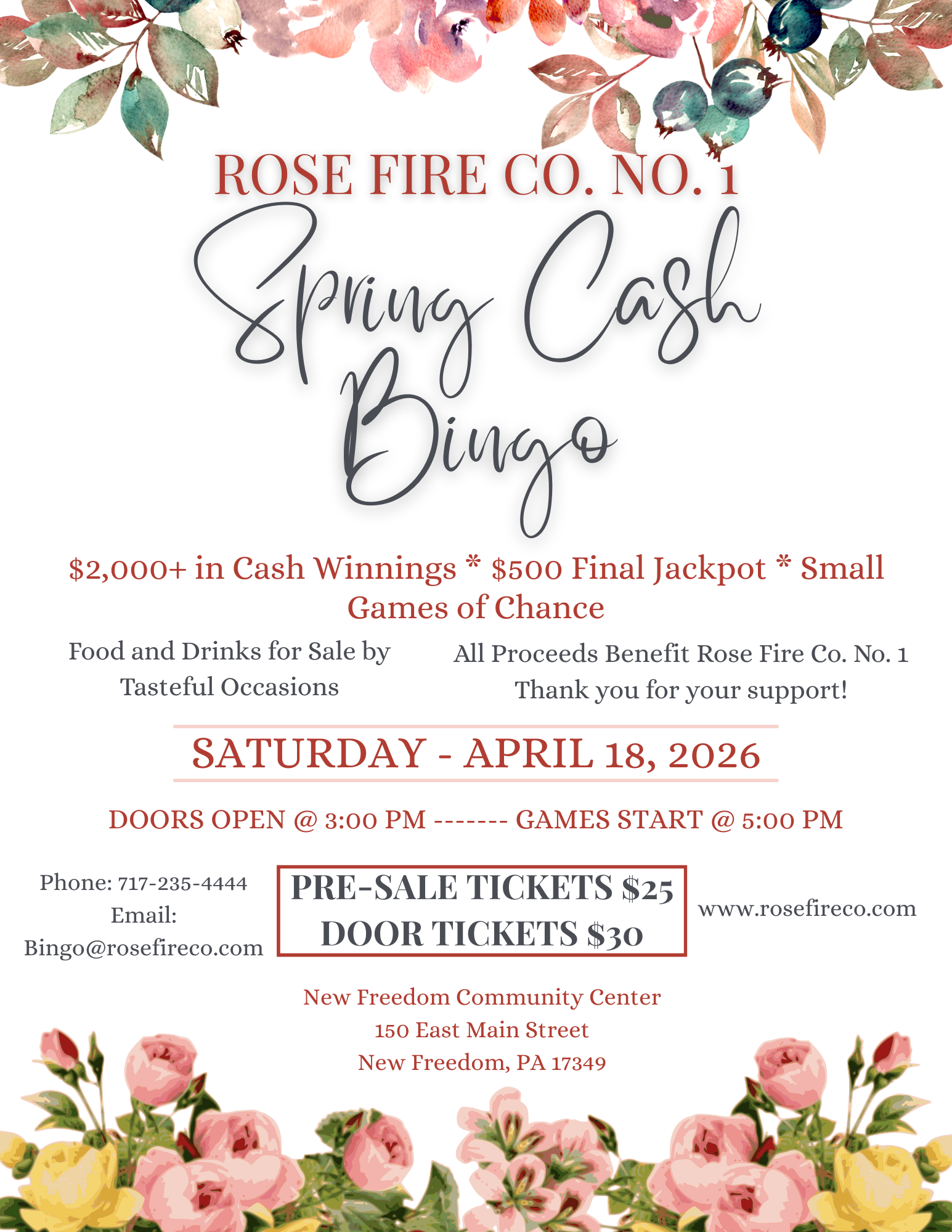 Rose Fire Company No. 1 invites you to our Spring Cash Bingo on Saturday, April 18, 2026 at the New Freedom Community Center. Gather your friends and family for an exciting evening filled with bingo, great food, and the chance to win bigβall while supporting your local fire company.